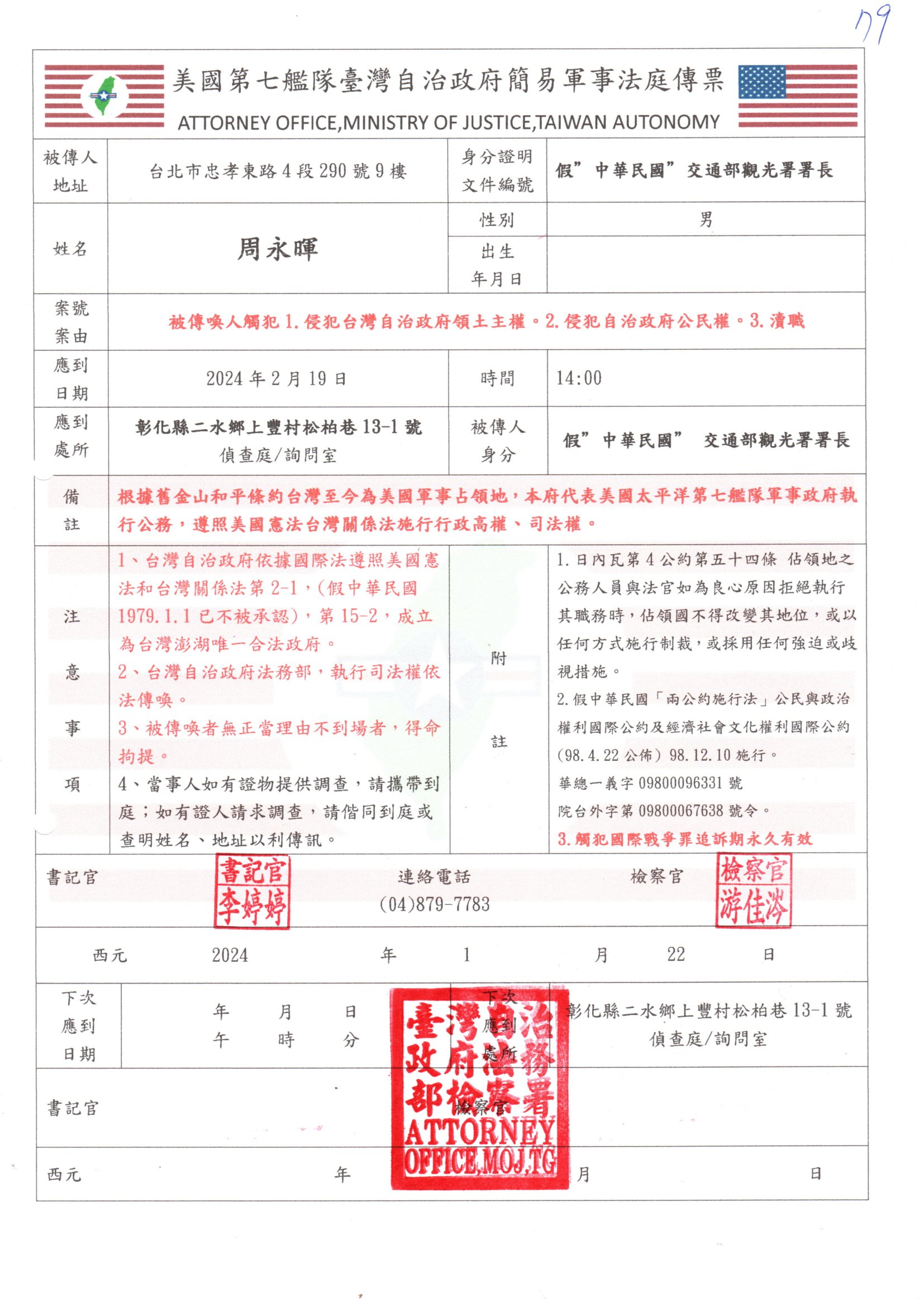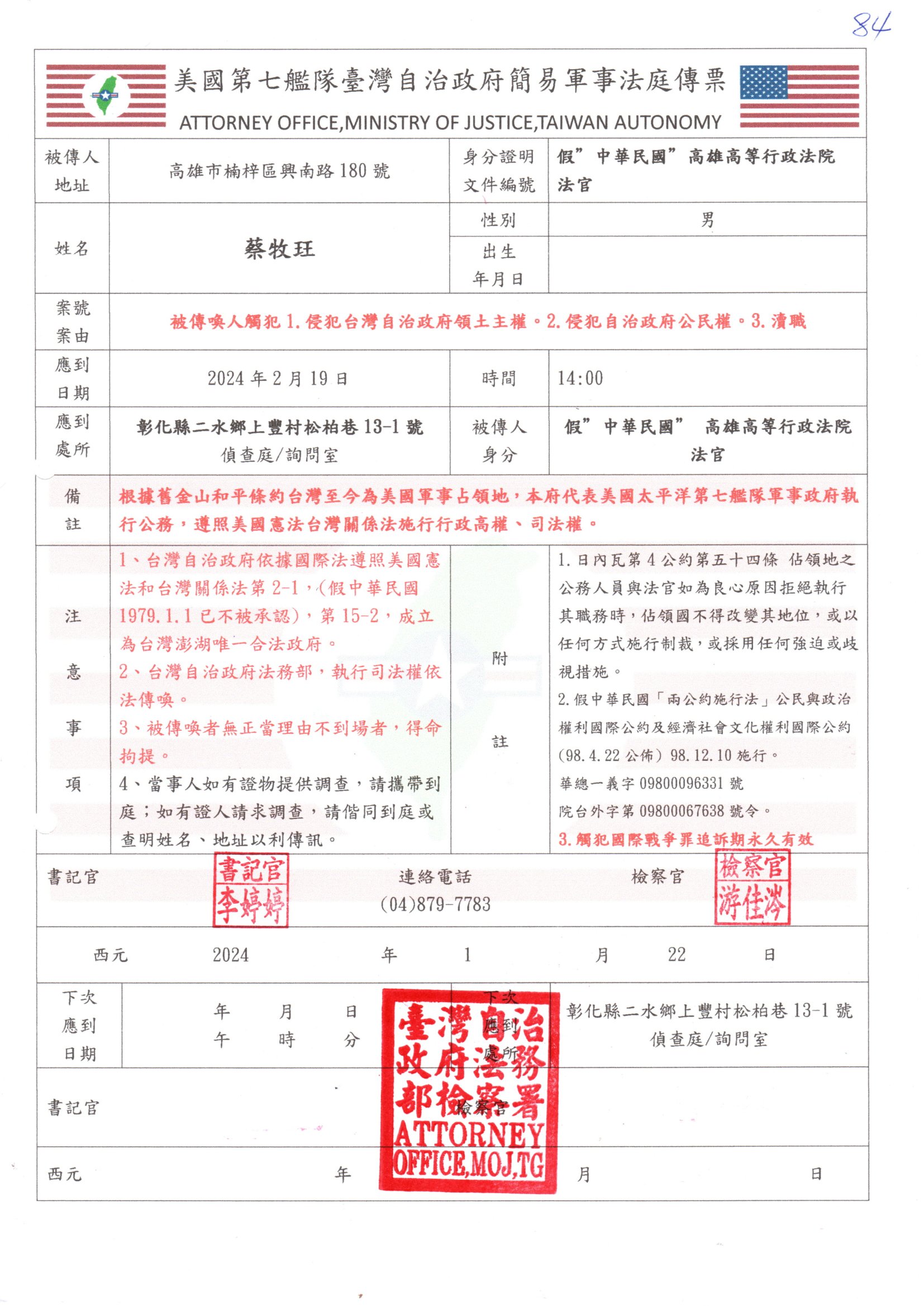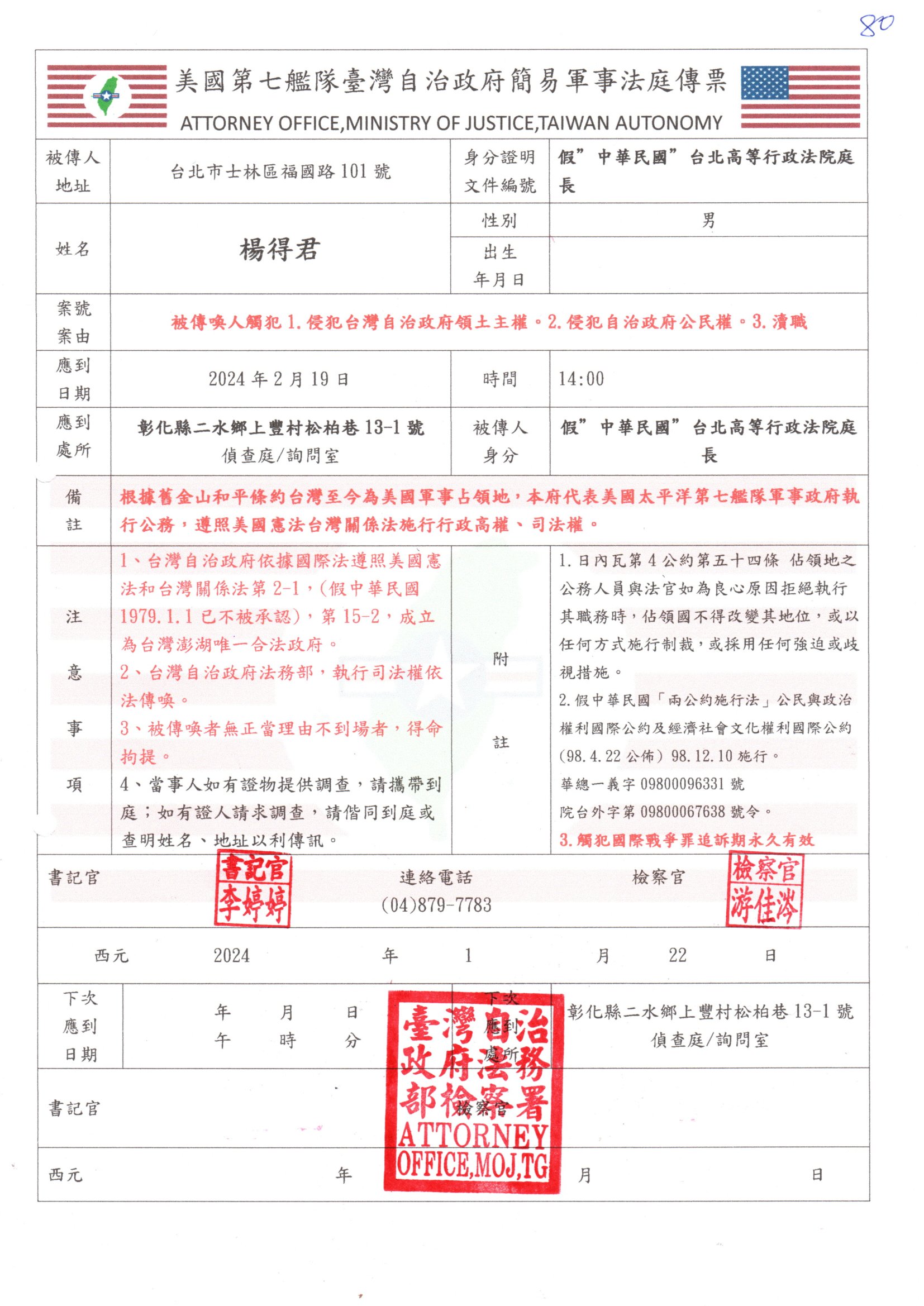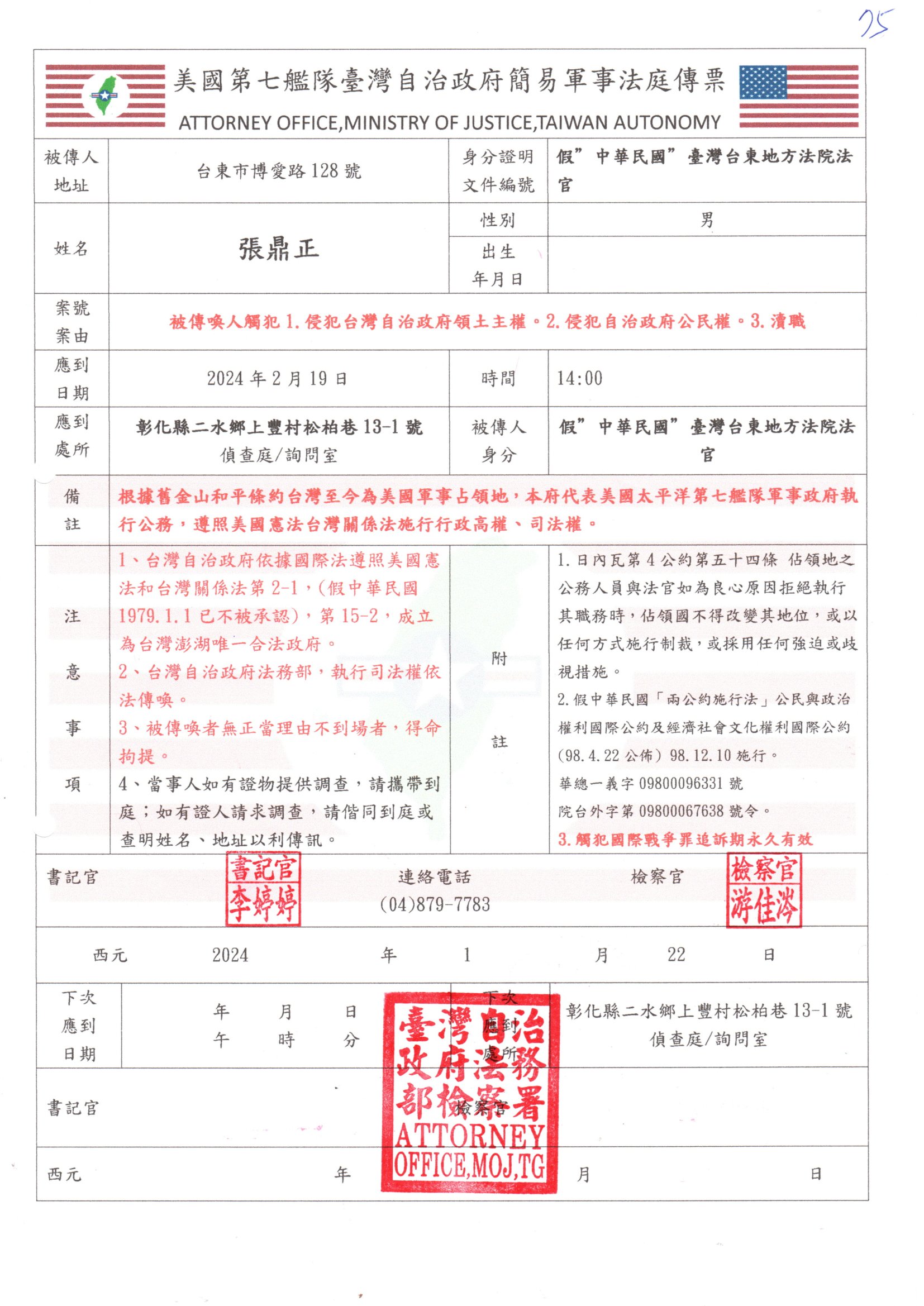 臺灣自治政府簡易軍事法庭傳票 - 20240122